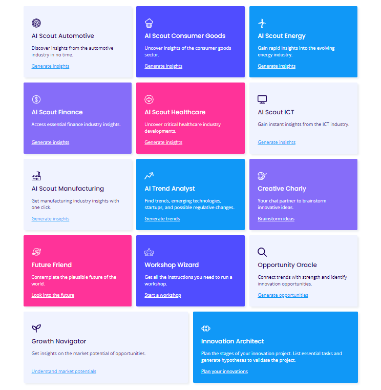 In ideation, the main task was to apply the right method to source the best ideas for the challenges at hand - so far. This typically involved crowdsourcing to attract external partners or the start of ideation campaigns. AI now opens an avenue to let the machine generate ideas with concrete details on desirability, feasibility, and viability. At the same time, it can crosscheck ideas against already existing providers that may have already developed a fitting solution. Plus, the idea-generation process itself can be enhanced. Try and check out our Creative Charly, which will help you generate or play through your idea and put it into a convincing concept. As the solution generation process is eased, the focus and task will switch to committing to the right ideas and acting on them as quickly as possible.