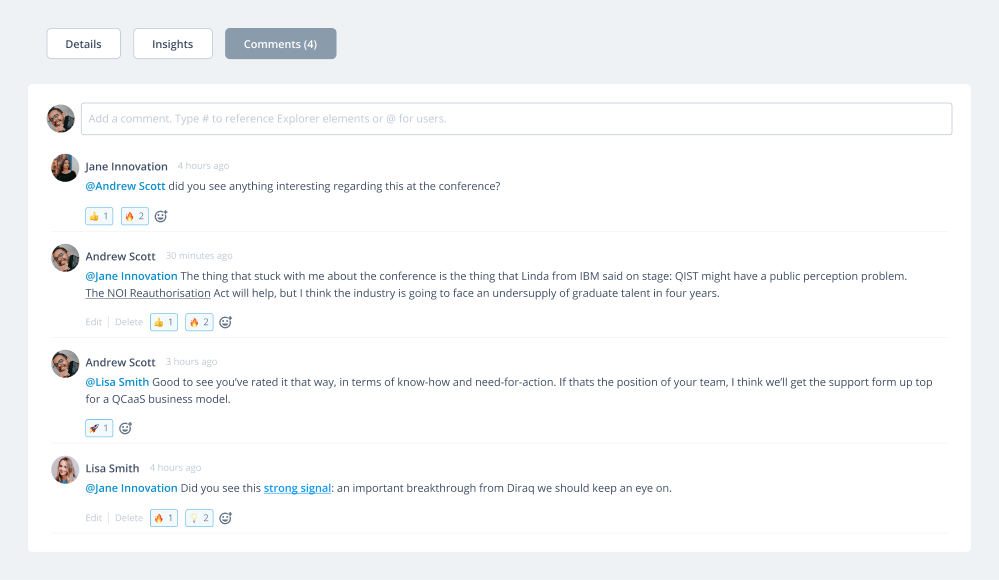 We've spruced up comments to make engaging with fellow innovators easier. Enjoy improved usability and stay in the loop with automatic email alerts for any updates on data you've interacted with. Get notified if someone mentions you in a comment on, for example, a specific trend, so you're always in the know.
