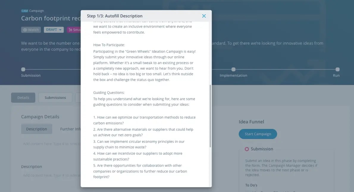 If you’re happy with the selection, click Create and the AI starts crafting your campaign description. The result is more compelling than the summary input and even provides five guiding questions to spur the thinking of participants. But if you’re unsatisfied with the description, just click Regenerate.