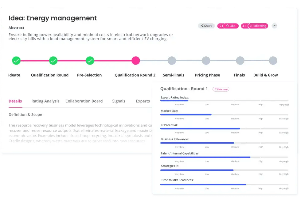 One solution to bring all your innovation efforts together, enrich it collaboratively and evaluate it across different views.