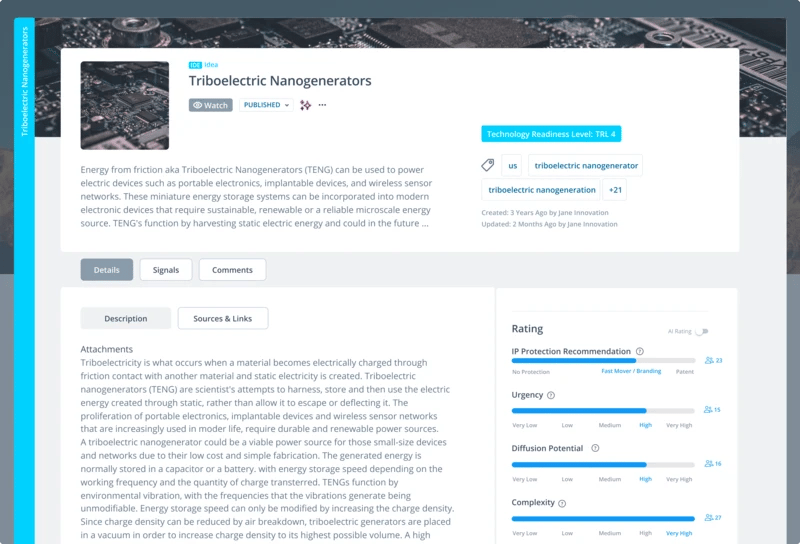 Once you have entered all relevant technology profile information in your Innovation OS, you can easily share this information with your technology experts and ask them to provide the necessary ratings on the diffusion potential, complexity, and urgency. Based on their judgments, you will easily identify the right IP protection strategy for your technology.
