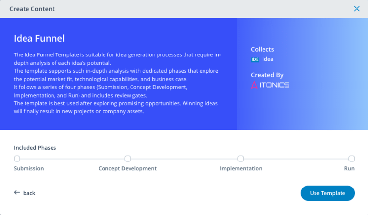 The idea funnel is an exemplary idea workflow available as a best practice in the Innovation OS. It consists of the following phases:
