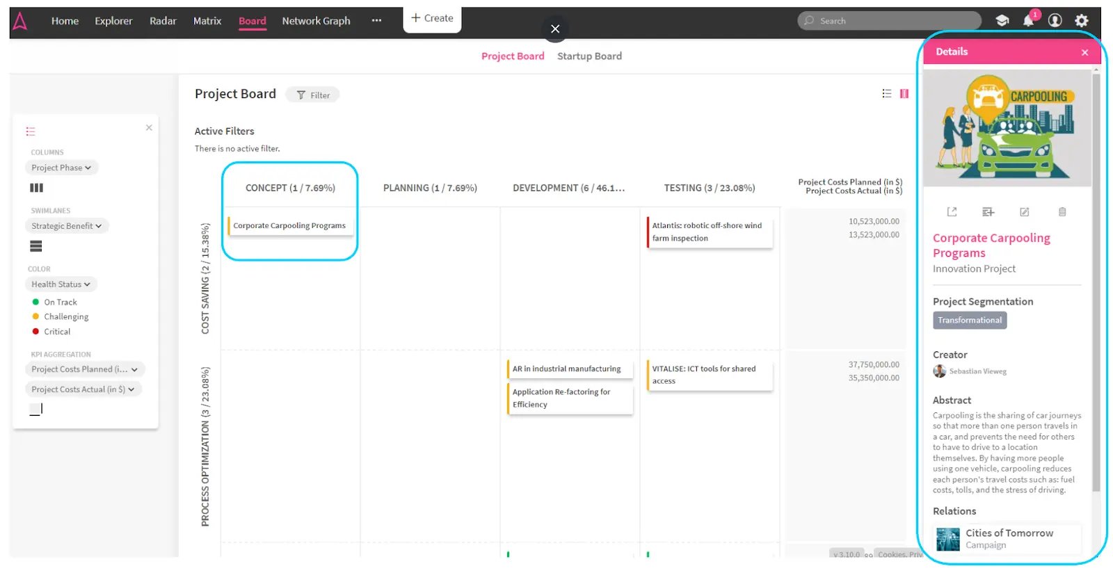 Innovate smarter with the ITONICS Innovation OS, the #1 innovation management software, to help you navigate the project lifecycle. As meeting your innovation objectives requires agile coordination of activities across multiple business units and departments, the ITONICS Innovation OS provides Kanban boards – bringing all innovation initiatives and projects across the organization into view. Combine your Kanban boards with other tools in our Innovation OS, such as Roadmaps, Radars, Matrix, and Ratings, to gain the maximum benefit and steer the execution of innovation initiatives.